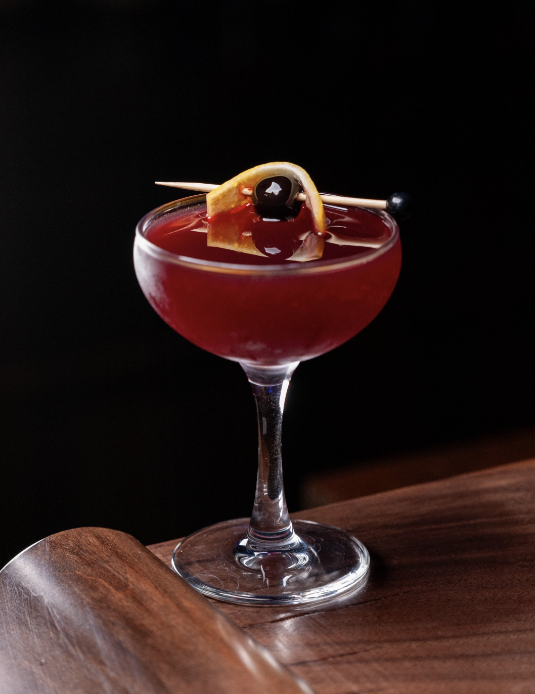 In a mixing glass, combine the ingredients with ice and stir gently until well chilled, about 30 seconds. Strain into a chilled coupe glass and garnish with a twist of lemon and a Luxardo cherry.