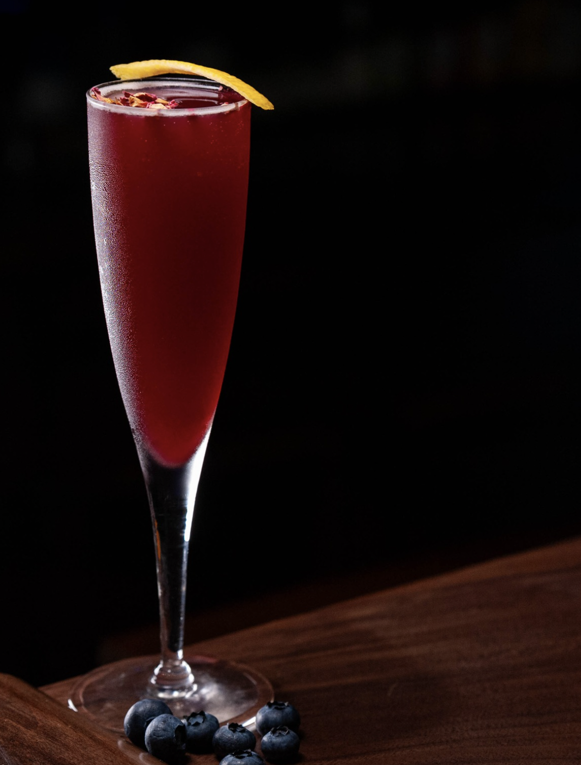Combine the first six ingredients in a shaker with ice. Shake and strain into a chilled champagne flute. Top with the sparkling wine and garnish with a twist of lemon and a few edible flowers.