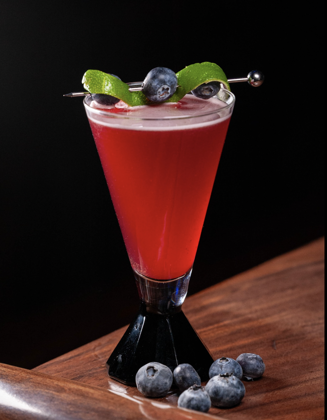 Combine all ingredients in a shaker with ice. Shake and strain into a chilled martini glass. Garnish with a twist of lime and a few blueberries.