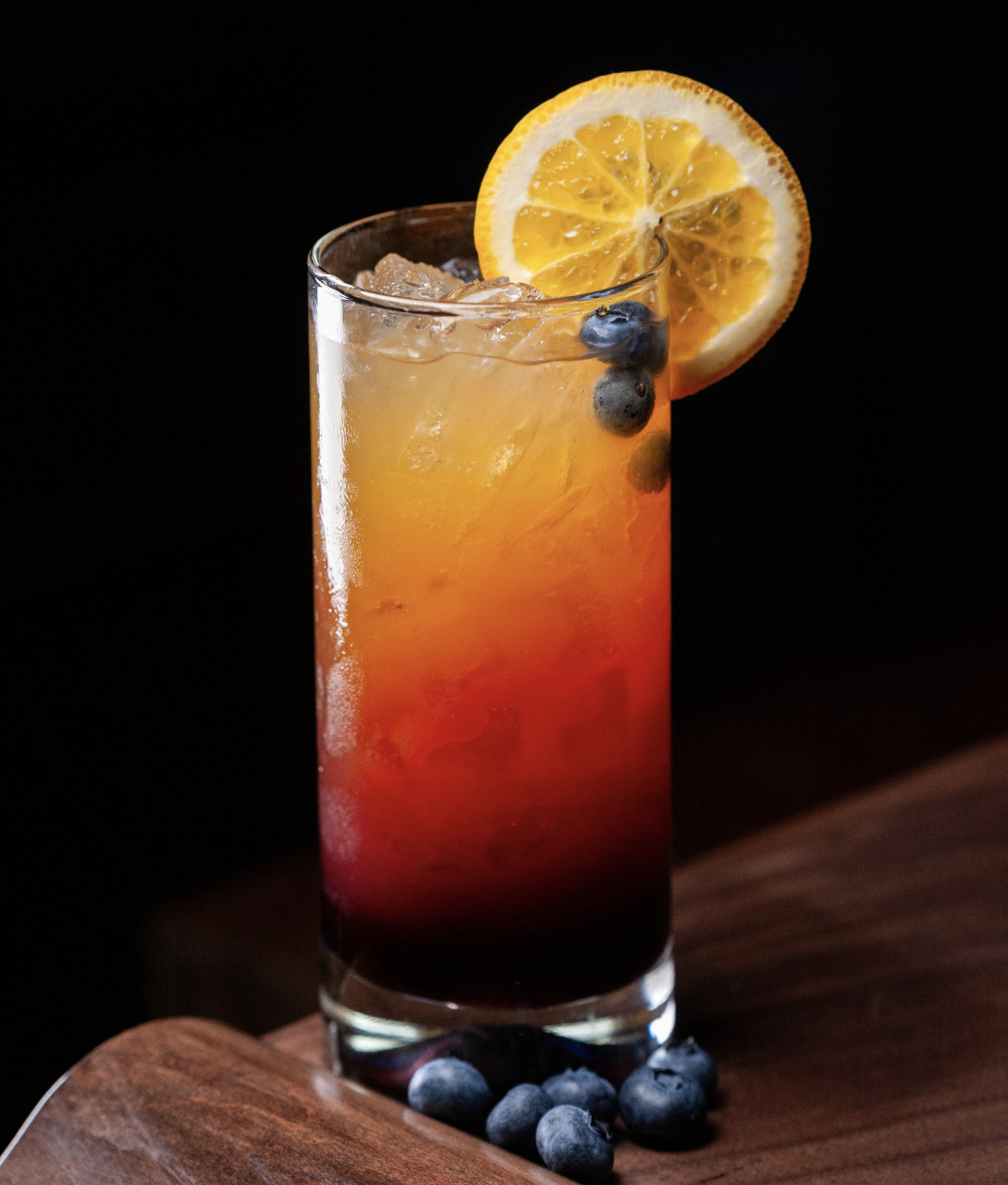 Fill a highball glass with ice and add the Fruitful Mixology Açaí Liqueur. In a shaker, combine tequila and orange juice. Shake well and strain into the glass. Stir gently to create the ombre effect. Garnish with an orange slice and a few blueberries.