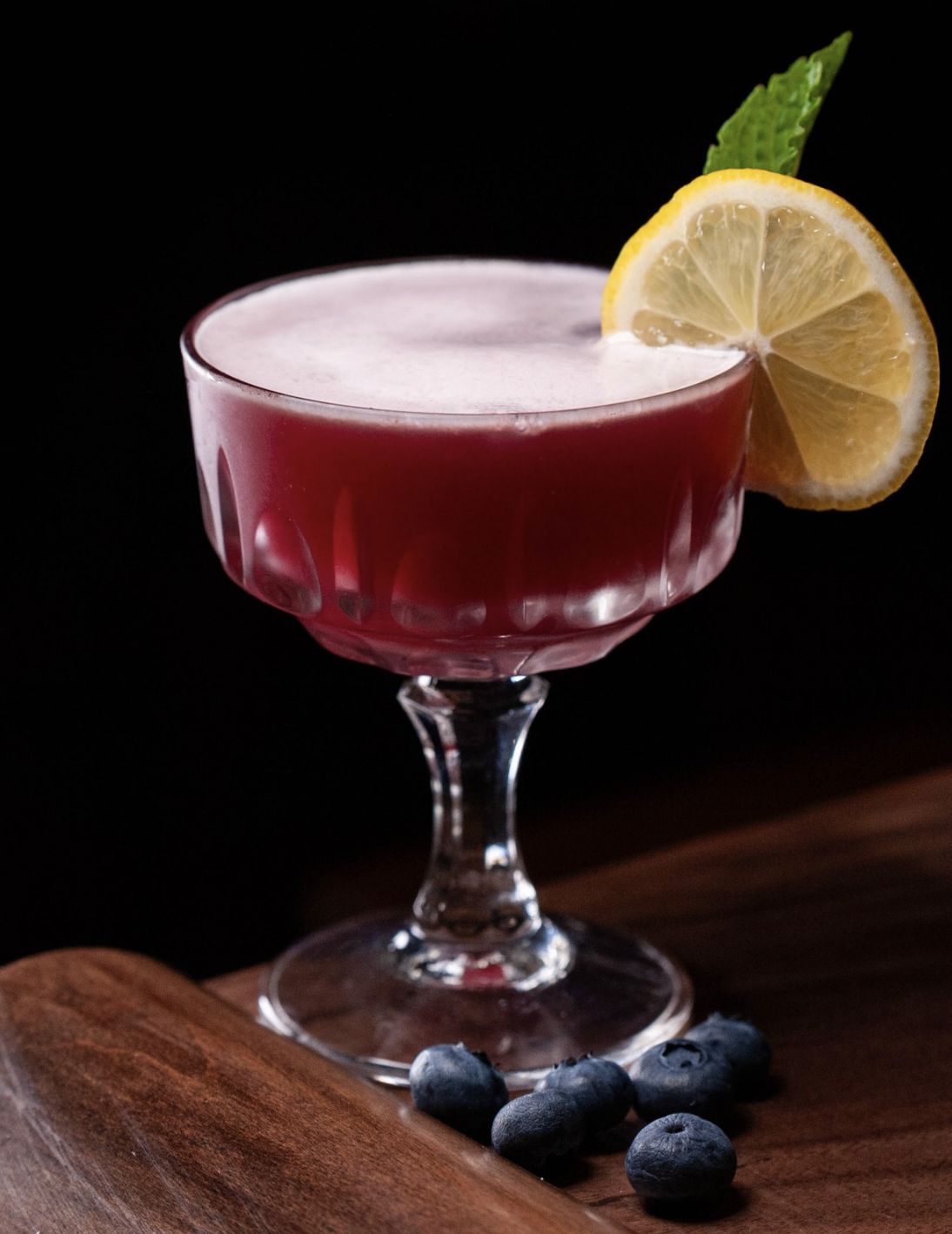 Combine all ingredients in a shaker without ice. Dry shake vigorously. Add ice and shake again until well chilled. Strain into a chilled coupe glass or over fresh ice in a rocks glass. Top with club soda and garnish with a lemon wheel and a sprig of fresh mint.