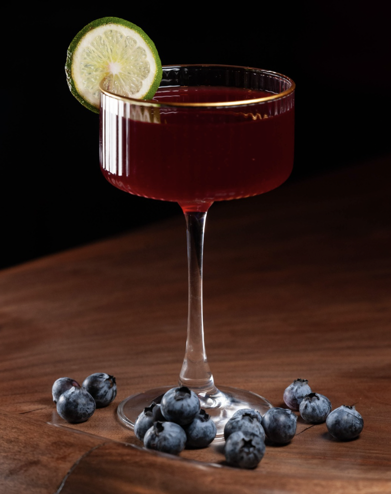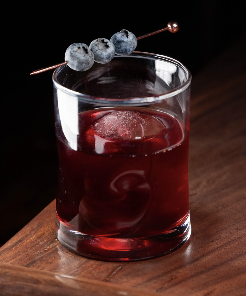 Combine ingredients in a mixing glass. Stir with ice until well chilled and strain into a lowball glass over a big ice cube. Garnish with fresh blueberries.