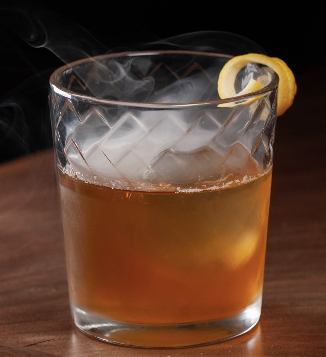 Smoke a rocks glass. Combine all ingredients in a mixing glass. Stir until well chilled and strain into the smoked rocks glass over a big ice cube. Garnish with a lemon peel.