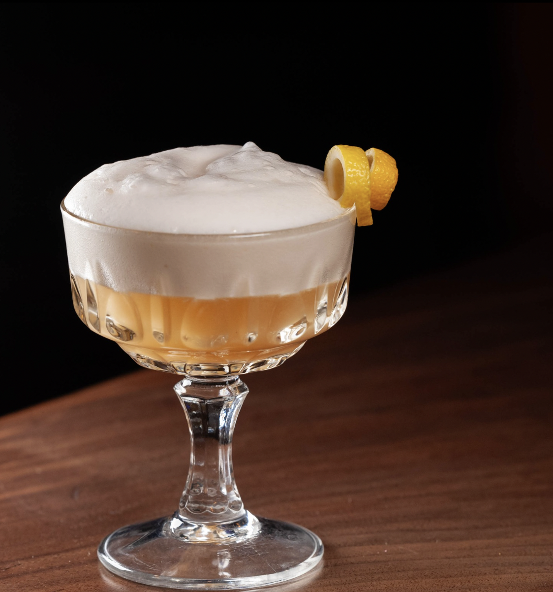 Combine all ingredients in a shaker without ice. Dry shake vigorously. Add ice and shake again until well chilled. Strain into a chilled coupe glass or over fresh ice in a rocks glass. Top with a splash of club soda. Garnish with a lemon twist.